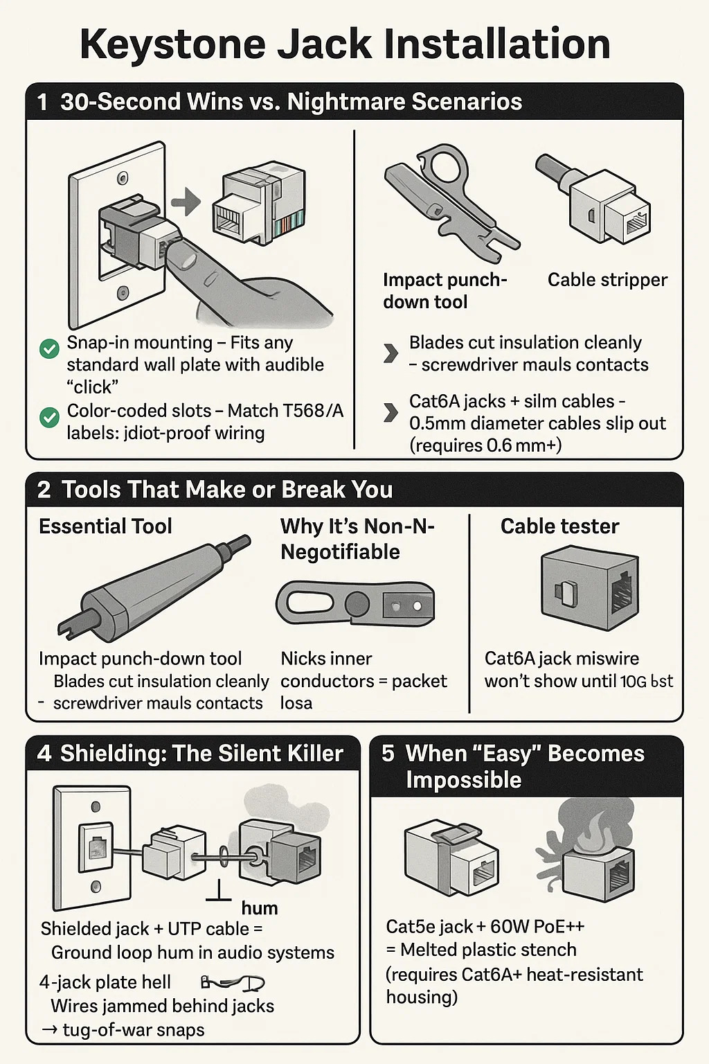 تلههای شکست فوری: * تلاش کابل رشتهای – تیغههای IDC سیمهای رشتهای را خرد میکنند (فقط هسته جامد!). * جک های Cat6A کابل های باریک - کابل های با قطر 0.5 میلی متر بیرون می روند (نیاز به 0.6 میلی متر است).
