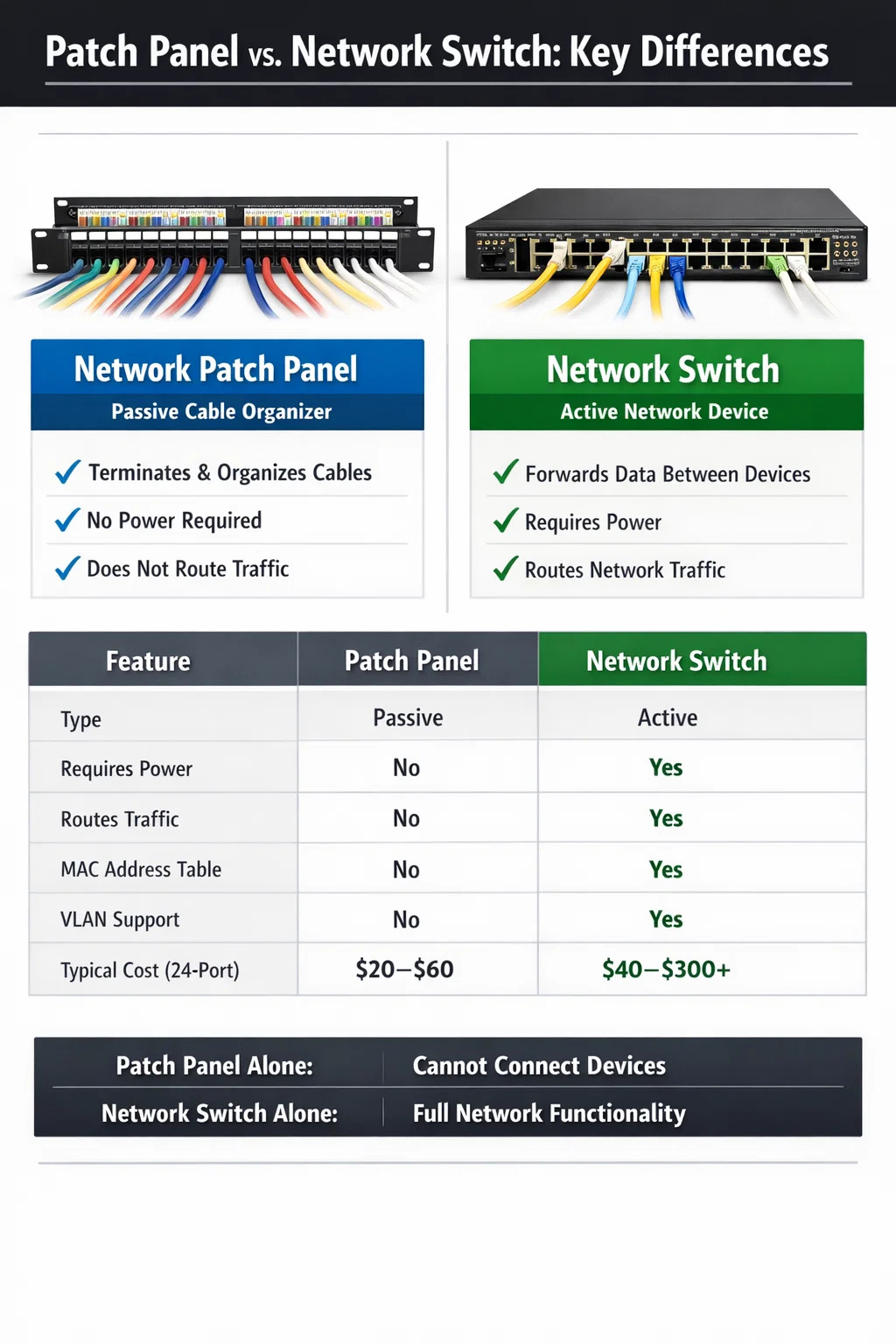 به ردیف آخر توجه کنید: سوئیچ می تواند بدون پچ پنل کار کند، اما پچ پنل نمی تواند هیچ عملکرد شبکه ای را بدون سوئیچ ارائه دهد. این تأیید می کند که اگر مجبور باشید فقط یکی را انتخاب کنید، سوئیچ دستگاه غیرقابل مذاکره است.