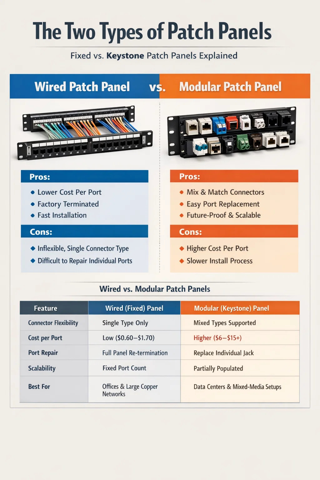 دو نوع اصلی پچ پنل ها هستند پچ پنل سیمی (ثابت) و پچ پنل های مدولار (کی استون). . این دو دسته اساس کابل کشی ساخت یافته را تقریباً در هر مرکز داده، اتاق سرور و نصب شبکه تجاری تشکیل می دهند. درک تفاوت بین آنها قبل از خرید یک پچ پنل شبکه یا طراحی یک طرح کابل کشی ضروری است، زیرا انتخاب اشتباه می تواند هزینه، انعطاف ناپذیری یا مشکلات عملکرد غیر ضروری را ایجاد کند.
