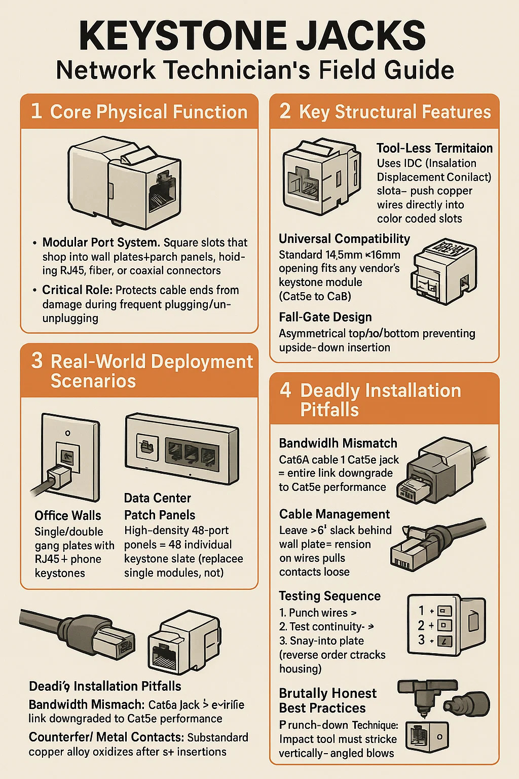 سیستم پورت مدولار: شکافهای مربعی که به صفحات دیواری/پانل های پچ می چسبند ، در حال نگه داشتن RJ45 ، فیبر یا اتصالات کواکسیال هستند. کابل های درون دیواری را به درگاه های قابل دسترسی کاربر تبدیل می کند.