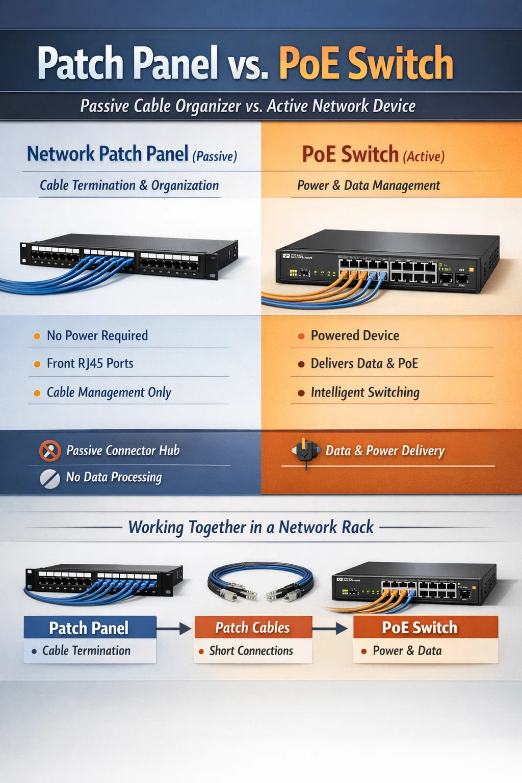 در نصب حرفه ای، این دو رقیب نیستند بلکه شریک هستند. پچ پنل یک نقطه فرود ایستا برای تمام سیمهای ساختمان فراهم میکند و سوئیچ PoE اتصال و برق مورد نیاز برای کاربردی کردن این سیمها را برای دستگاههایی مانند دوربینهای IP، تلفنهای VoIP و نقاط دسترسی بیسیم فراهم میکند.