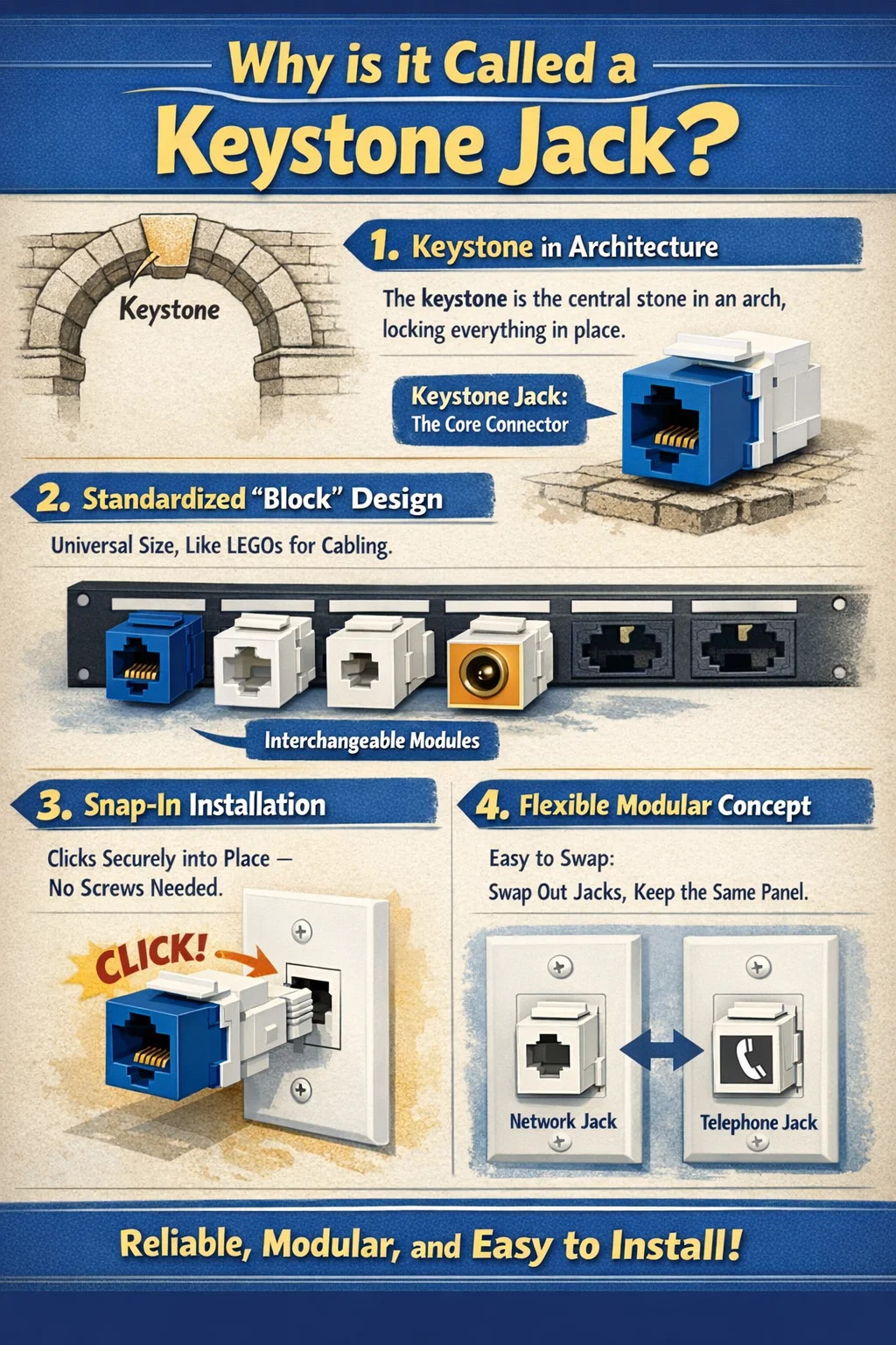 دلیل نامیده شدن این کانکتور شبکه به جک Keystone به دلیل تشابه بسیار مناسب مربوط به طراحی و روش نصب آن است.